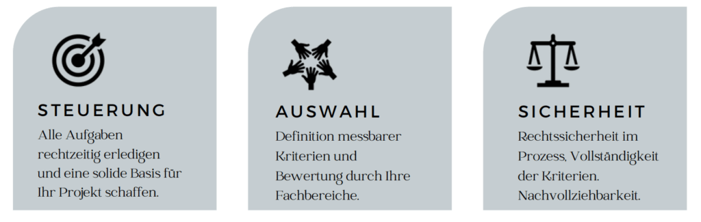 Auf Wunsch stellen wir Ihnen geeignete Templates und Kriterienkataloge für die Phasen im Ausschreibungsprozess bereit.